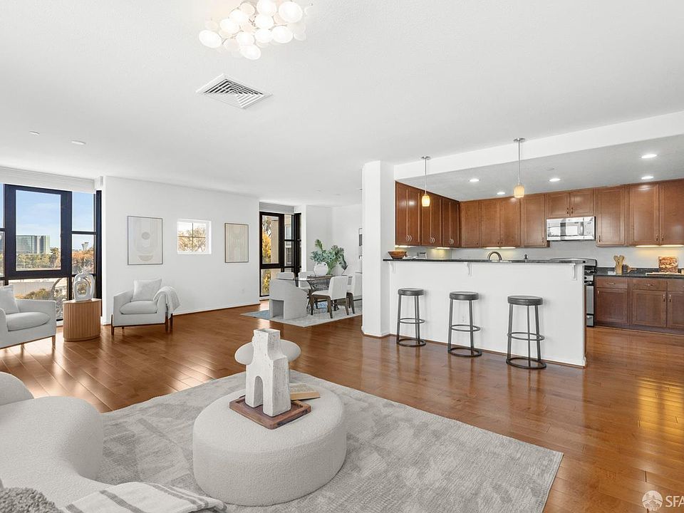 Located in the highly desirable Park Broadway community, this expansive third-floor residence offers 3 bedrooms, 2 full baths, 1,852sf of living space, plus a versatile bonus area ideal for a home office, fitness space, or creative space. The open-concept living, dining, and kitchen area is defined by generous proportions and floor-to-ceiling windows which create an airy, inviting atmosphere while filling the space with natural light. The kitchen features granite countertops, stainless steel appliances, and ample workspace. The primary suite comfortably accommodates a king-sized bed and features a large walk-in closet. Its en-suite bath features a dual sink vanity, walk-in shower, and oversized soaking tub. Two additional spacious bedrooms with ample storage share a full hall bath, and a laundry closet with newer full-sized washer/dryer adds convenience. Community amenities include a well-equipped fitness center, outdoor patio with built-in grills, secure building access, and underground parking. This home also comes with two assigned parking spaces conveniently located across from the elevator, plus a large storage unit. With easy access to SFO, BART, Caltrain, Hwy 101, top-rated Millbrae schools, shops and restaurants, this home combines comfort, convenience, and location.