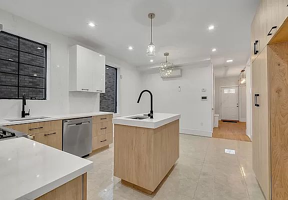 Your dream one-family detached home in the heart of Midwood. Situated on a 30 x 100 lot, with high-end finishes, 5 bedrooms, and a private driveway, this gem is tailor-made for the life you live. Behind the tasteful brick-and-stucco facade and porch lies the chic and functional living space you're looking for. Step into an airy, sun-dappled living and dining area, illuminated by inset spotlights and an elegant light fixture. The custom covered radiators provide central heat in style, with an additional heat and air conditioning unit. The stone wall accent complements the sleek neutral floor tiles and adds a unique focal point to this elegant room. Delight in the upscale kitchen, with wood-look accent cabinets adding a warmth to the dramatic black fixtures and white cabinetry. The ingenious layout allows for meat and dairy to be in totally separate areas, making cooking a breeze. The top-of-the-line GE Profile(tm)30" Smart Slide-In oven and range hood, plus additional wall oven, were carefully curated with your family's culinary needs in mind. Designed with eye for detail, the kitchen includes an under-cabinet electrical outlet, leaving the stone counters and backsplash simple to clean. Enjoy the comfortable eat-in space, just under the designer light fixture, for a cozy meal with the family. Just off the kitchen is a room perfect for a playroom, a stunning bathroom and bedroom (great for visiting parents), all with beautiful weathered-oak flooring. The second floor features a master bedroom with upscale en-suite bathroom; large, impressive bedrooms with closets, plenty of sun and oak flooring; a laundry corner; and additional beautifully designed modern bathroom. Head up to the bright, airy third floor for an additional bedroom with built-in closets, perfect for teens or guests. Kids need some space to run free? Open the back door and peek out at the sweet outdoor play area. With its prime location and perfect layout, we know you'll be thrilled to call 1388 your home.