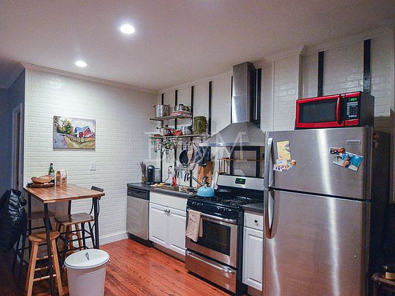 Rear yard oasis with direct access from the apartment is private to the apartment. Renovated true 2 bedroom, both with double hung closets and storage above, bedrooms are on opposite ends of the apartment for privacy. Front bedroom is very large with room for a HO. Rear bedroom is also large and faces the private garden. Fully renovated kitchen with exposed brick, shaker cabinetry, and a stainless steel appliance package, including a dishwasher and vented range hood. High ceilings throughout with recessed lighting and exposed brick complimenting the original refinished maple floors. Modern renovated bathroom features white and black subway tiles, a glass enclosed shower and new fixtures. Tons of closet space for all of your extras. Heat and hot water are included which is a huge savings over most new or renovated units. Pet friendly building. Steps to the Knickerbocker M, and close to the DeKalb L. Shown by appointment. 1 month broker's fee.