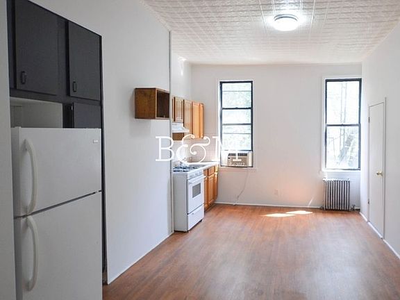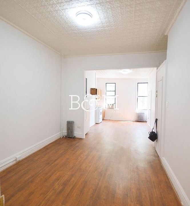Not many rent stabilized units are as large as this one. Four large rooms in a turn of then century building which has a nicely renovated hallway and common areas. Enter into the enormous eat in kitchen which has room for a table and 6+ chairs and additional cabinetry/shelving unit. The open windowed kitchen is no frills and has basic cabinetry and appliances. Windowed ceramic tiled bathroom, with tub, is off to the right. Off of the eat-in-kitchen is a large living room and then a big bonus room where you can work from home, have a guest or spare room, or a big walk through closet. The last room is the bedroom which has original period moldings and a ceiling rosette. It is large enough for a king sized bed and has plenty of room for bedroom furniture. The entire apartment has original pressed tin ceilings that have been lovingly restored. Heat and hot water are included. No laundry in the building. Broker's fee is 15% of the annual rent. This is a rent stabilized unit. Less than a block to the train Pet friendly Move in Sept 15th or October 1st Huge 4 Room Pre War Railroad Style Apartment with High Ceilings Steps to the Subway