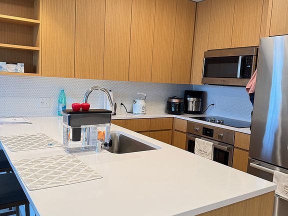 Sky Ala Moana West Unit 2001 offers breathtaking panoramic views of Honolulu's skyline, lush mountains, and sparkling ocean from its floor-to-ceiling windows and private lanai. The modern kitchen features sleek cabinetry, quartz countertops, and high-end Bosch appliances, creating a seamless blend of style and functionality. Residents enjoy exclusive access to resort-style amenities, including a luxurious pool, open green spaces, and a fully equipped fitness center, as well as the Sky Terrace Spa in the connected hotel tower, featuring a steam and dry sauna, Ofuro, and a refreshing cold plunge for ultimate relaxation. Owner Pay for water and sewer. Tenant pay for electric