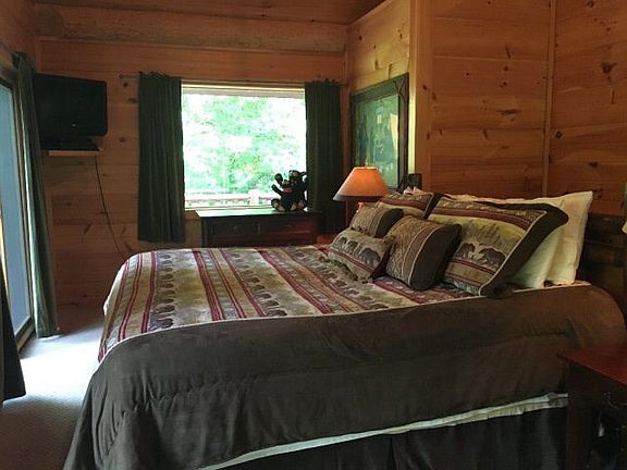 Black Bear Pond is an adorable cabin in the woods with it's own pond in gated Fontana View by Fontana Lake. And the fabulous rental income proves that guests love the cozy ambiance and rustic charm making it an excellent investment. The temperate Smoky Mountain climate invites you outdoors to the wrap around decks upstairs and down, complete with a hot tub under the stars. There's additional room to roam in the yard around the pond area with the creek trickling through and the historic old homestead fireplace with custom bear benches around a fire pit. An additional fire pit is in the back yard. Cozy up in front of the fireplace in the living area and pop in your favorite old movie or the big game. The spacious master suite and huge master bath with a dressing area and tiled shower are totally ensconced with windows and French doors that gives you the feeling of living in a tree house. Fontana View is a well maintained, popular, gated community conveniently located next to Fontana Lake bordering US Forest Service property and very close to the Almond Boat Dock, Tsali Rec Area, Lemmons Branch Public boat ramp, the Dragon's Tail and just around the corner from Nantahala Gorge.
