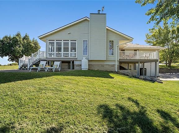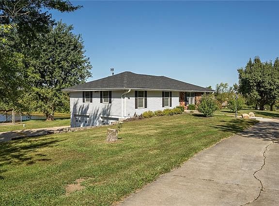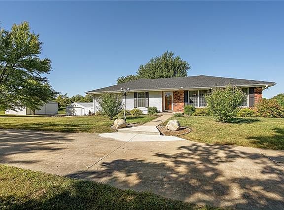 This might be the one you've been waiting for! Country living at its finest: 10.886 +/- acres, 2 outbuildings, stocked pond, and nice home all on blacktop road within 30 minutes of KCI! You can be in before the holidays. The large kitchen is great for baking with plenty of counter space or for preparing those holiday dinners. The Great Room can accommodate that ginormous TV you've been wanting and plenty of room for seating as you root for your favorite team! Catch those beautiful sunsets over the pond from your enclosed porch or patio. The 2 outbuildings are perfect for your toys, equipment, tools or projects and the concrete driveway keeps things tidy. Roof replaced in 2020. The property is being sold "as-is" and listing agent is a co-trustee of Seller. Sq ft, room sizes, acreage, taxes are all estimates and to be verified by Buyer and Buyer's Agent.