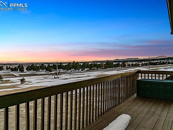 WOW! Expansive views of open space land, Pikes Peak & Spanish Peak from this ultra private, south-facing 5.52 acre lot. Updated raised ranch 3 bed, 3 bath home with over 2800 sqft living space with spacious rooms throughout. Some Updated Features: roof & gutters (2023), most windows, 2-cycle Carrier furnace (2020), water heater (2020), some interior paint, upgraded Honeywell smart thermostat. Enter to find an open floorplan with newer luxury vinyl hardwood floors in the family room & entryway. Electric fireplace in family room included! Generous kitchen boasts ample cabinets & counter space, black stainless-steel appliances (newer refrigerator, brand new dishwasher), glass tile backsplash & convenient desk space. Open to the dining area & access to the back patio with included hot tub. Relax in the sizeable Primary Suite, complete with sitting area, large walk-in closet & remodeled attached bath. The 4-pc Primary bath has a frameless shower, large soaking tub & updated surround. Second spacious bedroom with large wall closet, located across hall from beautifully remodeled 3/4 bath. Laundry room conveniently located in main hall- includes W&D, shelves & racks. Head down to the finished basement that has a sizeable rec/bonus room for more living space plus an office with closet & built-in shelves (no window). Bedroom 3 has a sitting area, large closet & attached, updated full bath. Storage room & many closets throughout. Ceiling fans in many rooms. Oversized 2 car garage offers even more storage space. Awesome expanded upper front deck with privacy shades & those views! Zoned for horses, plenty of room to add outbuildings. Private well & septic. Easy 15 min to get to I25, or 25 min to Colorado Springs via Woodmen Road or Hwy 24. The town of Falcon is 20 min south. If you are looking to enjoy the benefits of Colorado country living – this is a must see!