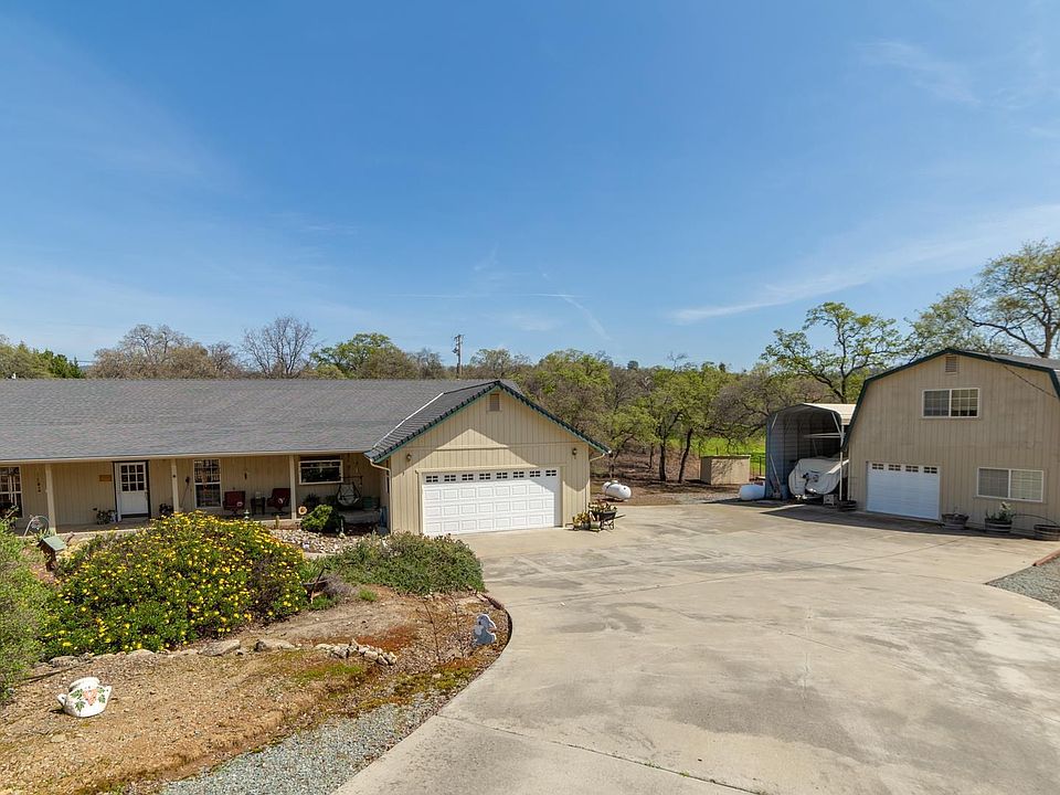 Move-in ready Ranchette in quiet rural area. Comfortable and well maintained single story, custom built home on 2.1 Acres. 3 Bedroom 2 bath with attached garage and separate shop building with apartment and an RV carport. The home is well built with a great room concept. Covered porches front and back for outdoor entertaining during balmy summer evenings. Cozy wood stove helps you keep tosty in the winter. High quality tile floor in the great room area. Cooks kitchen with large island, tons of cabinets and all conveniences. Roomy master bedroom with sliding glass door out to back deck, large walk-in-closet, jetted tub to luxuriate in, separate shower and double sinks. Hobby room, could be 4th bedroom. Shop building has garage area as well as an apartment with 1 bedroom, large living room, kitchen and bath. Located close to recreational opportunities like large lakes, Sierra's with Yosemite National Park, charming and historic gold mining towns.