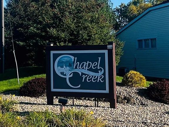 Chapel Creek Condo! Overlooking the tranquil pond & scenic landscaped bluff! 3 Bedrooms & 2 Full Bathrooms. Vaulted Great Room/Dining Room Combo. 3rd Bedroom would make great office or den with pocket doors & vaulted ceiling. Eat-in Kitchen w/ appliances that remain. Enclosed Florida Room & Patio. Nice Skylights throughout living space. Newer Vinyl Plank Flooring, Newer HVAC. 2 Car Attached Garage. Owners Suite is Huge w/ handicap accessible tub/shower system, dual sink vanity, & walk-in closet. 2 Car Attached Garage. Immediate Possession! Association Dues are $200 monthly and cover exterior lawn maintenance, snow removal, & roof.