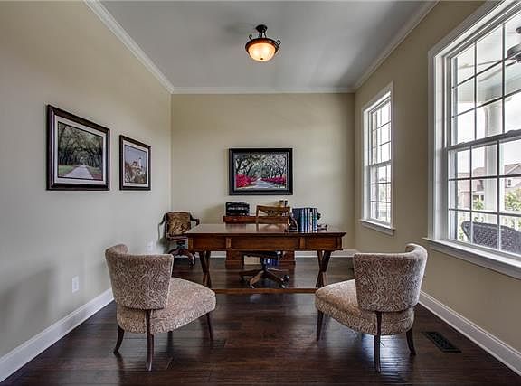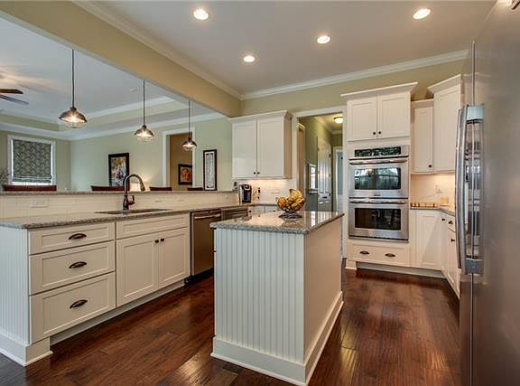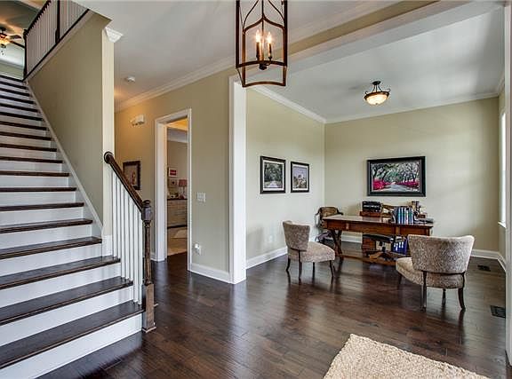 Southern living at it's finest! Double covered porches/ Gourmet Kitchen (granite/subway tile/island/break bar). 10 ft ceilings/8 ft doors/ hdwd flrs. Great room, Master down & up. Extra closets. Den 2nd flr, unfinished room above garage. Comm pool.