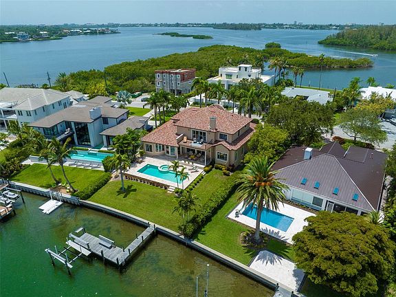 Step into this exclusive mainland estate, characterized by timeless architectural design and deep water anchorage that perfectly embodies the many qualities of this uniquely crafted residence. Nestled within the sought-after San Remo Estates, widely recognized as the geographic center of Sarasota, this property offers proximity to downtown Sarasota, Siesta Key, and Southside Village, making it a prime location in a thriving market. Crafted by esteemed builder Bill McGinness, this home stands on a foundation of 54 sturdy concrete pilings, showcasing both reliability and artistry. A comprehensive renovation in 2015 further enhanced its allure. The property boasts stunning panoramic water views in every direction, extending from a sprawling private lot with a meticulously equipped boat dock on the sheltered deep water harbor. The interior layout is thoughtfully designed with an expansive open floor plan that seamlessly guides you through its sophisticated spaces. Abundant natural light illuminates the architectural details and millwork, including coffered ceilings and two elegant gas fireplaces. Anderson sliding doors and windows, along with rich wood flooring and lightly polished travertine, contribute to the atmosphere of refined luxury. A new air conditioner and ADT security system provide modern comfort and safety. The potential for an elevator is accounted for in the layout. The main level hosts the owner's quarters and a well-appointed office, while the second level encompasses three bedroom suites and a spacious TV/game room that could easily accommodate a kitchenette, perfect for hosting gatherings. A balcony on the second level overlooks the captivating waterscape and pool area. The kitchen serves as a focal point, adorned with a seamless one-piece quartz-topped island and surrounded by an intimate family room and breakfast area. Premium wood cabinetry, granite-clad perimeter counters, and stainless-steel appliances exemplify quality and elegance. Convenient to the kitchen, a separate dining room is perfect for gatherings. Practicality is not overlooked, as the home features ample laundry facilities with extra closet space. The three-car garage is flanked by an exceptionally spacious double storage room. The outdoor spaces are designed for relaxation and entertainment, with expansive decks for dining and unwinding by the heated pool and spa. The yard is enclosed by a fence and adorned with mature landscaping, ensuring privacy and tranquility. In addition to its exceptional features, this property falls within the coveted Southside Elementary school district, enhancing its desirability for families. Indulge in the epitome of coastal luxury living in this extraordinary waterfront estate.