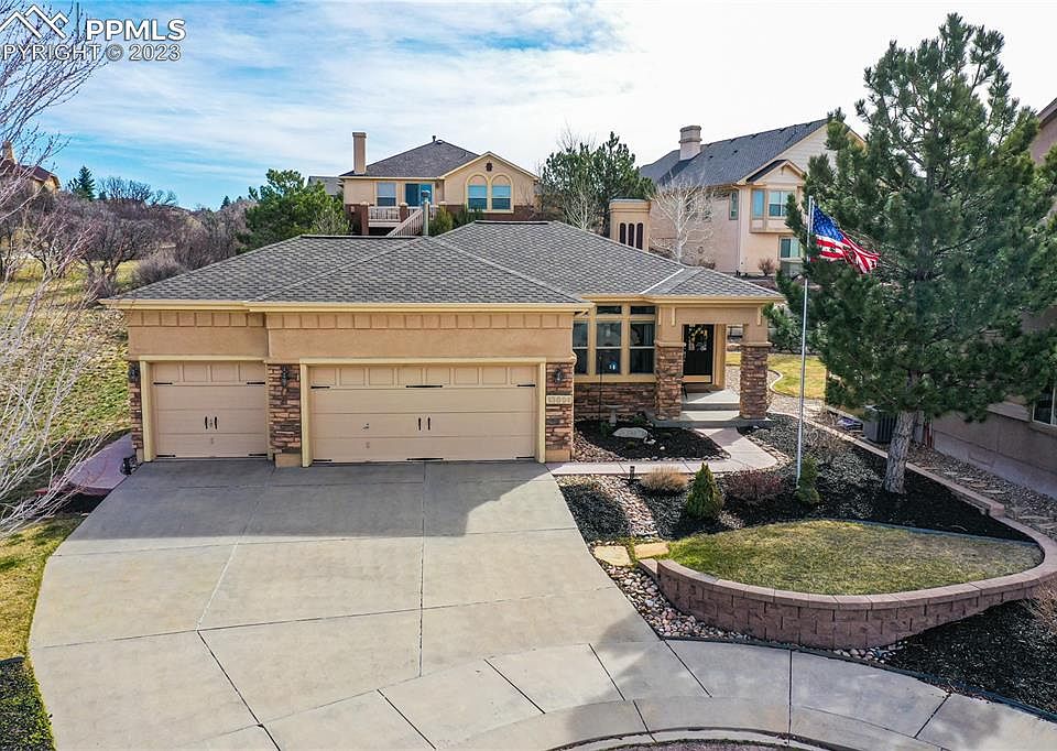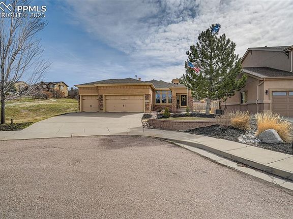 Stunning home in a quiet area of Flying Horse. Walking distance to elementary, junior high, and high school (Discovery Canyon). End of cul-de-sac location, fully landscaped with covered front porch and borders a neighborhood walking trail. Stunning hardwood floors as you enter. Great room has gas fireplace and bright, unique floorplan. French doors from kitchen to relaxing back patio area. Kitchen has many lower-cabinet pull out drawers and impressive custom pantry. Second bedroom on main level doubles as an office. Lower level has huge family room with wet bar and two additional bedrooms and bath. Close to all northern Colorado Springs amenities and restaurants, easy access to Powers corridor and I-25, shopping, Air Force Academy, and so much more. Check out this ideal ranch-style home with true main-floor living.