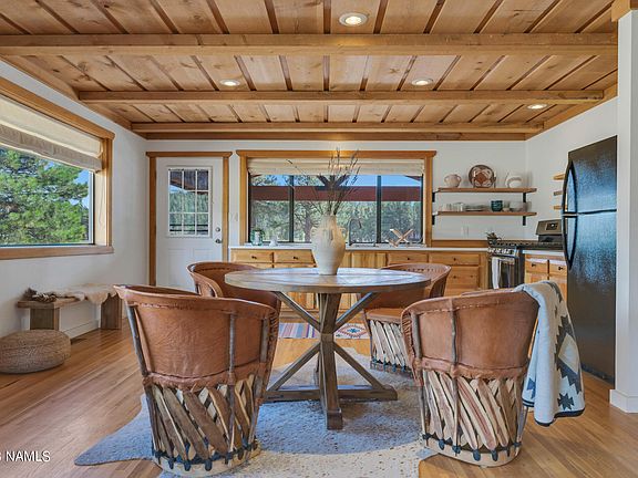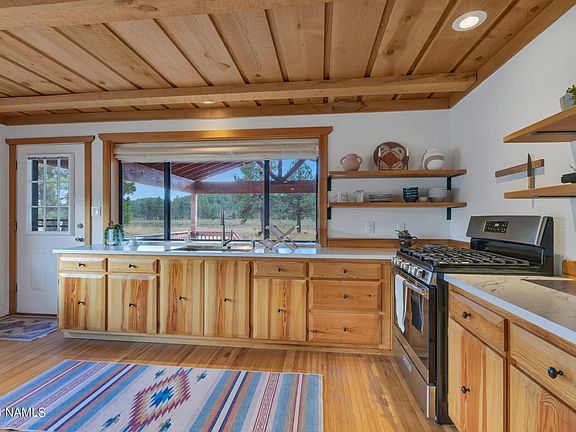 Welcome to this charming, fully furnished 2-bedroom, 1-bath cabin-style home in the picturesque community of Parks, Arizona. Nestled on a serene 1-acre lot off Keith Drive, this property is a hidden gem, offering a perfect blend of rustic beauty and modern comfort. With its recent interior design by the renowned KSDesigns, you'll find this home to be a haven of style and coziness. As you approach the property, you'll be immediately struck by the tranquil surroundings and the inviting curb appeal of this cabin-style home. The exterior boasts a front wood porch where you can unwind with a morning coffee or enjoy the scenic views of the community. Additionally, there's a covered back porch that provides the ideal spot for evening relaxation and outdoor dining. Step inside, and you'll discover an open floor plan that creates a sense of spaciousness and flow throughout the home. The interior design by KSDesigns is evident in every detail, with a fresh perspective that combines rustic elements with modern touches. The beautiful tongue and groove ceilings and wood beams add character and warmth to the living space, while hardwood floors provide durability and a timeless aesthetic.