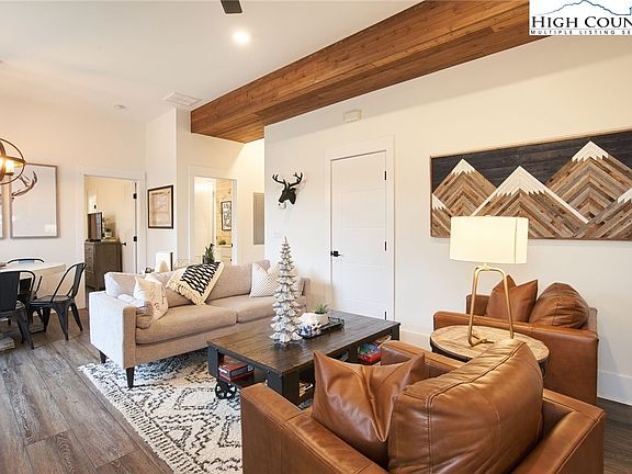 Move into this sophisticated condominium in the heart of Blowing Rock by the new year! Furnished down to pots, pans and linens in a smart contemporary style, this three-bedroom, three-bath, two-floor home with adjacent parking garage is move-in ready. Imagine that just outside your door are restaurants, shops, museums, churches and parks that are magnets for visitors. Built in 2020, the light-filled great room features a floor-to-ceiling stone fireplace with propane logs. Just across is comfortable seating for conversation and TV viewing. Adjacent is a well-designed, compact kitchen with custom cabinets and large granite countertops. A large window overlooks the nearby dining area. The primary bedroom is off the great room with an attractive tile shower. Across an enclosed laundry area has a washer and dryer. Just off the foyer are stairs to the second floor. Straight ahead is a second primary bedroom with king bed and en-suite tile bath with shower. Down the hall is a surprisingly covered outdoor balcony room with large hot tub and big flat screen TV for relaxing after hiking or skiing. There is a third private twin bedroom at the front of the home with adjacent tile tub and shower. This townhome has been built anew. Move in and personalize it to your preferences. Blowing Rock has been named for many years as one of the South's leading year-round visitor destinations. This charming Blue Ridge Mountain town has an entrance to the hiking trails and fishing of Cone National Park. It is the only town on the 469-mile Blue Ridge Parkway that has a direct entrance. Recreational areas Broyhill Park and the Robbins Swimming Pool Complex are a few blocks from the condominium. Two miles away is Appalachian Ski Mountain. Many organizations sponsor festivals, parades, art shows and tours. As the building is a condominium, a two-home POA will manage exterior maintenance. Short-term rentals allowed. Taxes are on whole building and taxes on each will be approximately one-half.