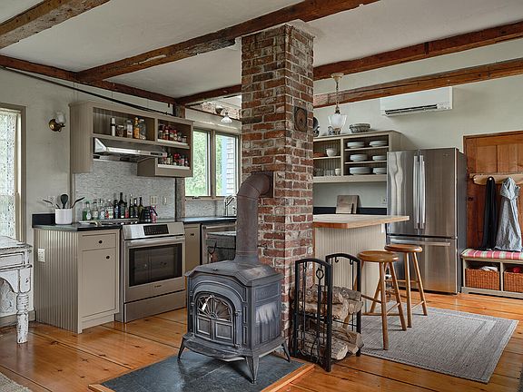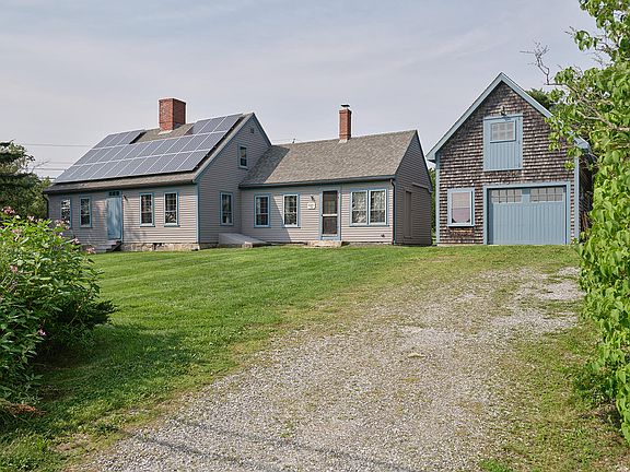 Welcome to the Briggs Butler House - an 1816 Antique Cape offering a harmonious blend of old-world character, modern conveniences, and energy efficiency. This well-maintained home sits on close to an acre of manicured grounds, complete with perennial flower gardens, a fire pit, a garden shed, fruit trees, and a treehouse, all overlooking the 584-acre Hayfields Preserve of the Maine Coast Heritage Trust, providing permanent unobstructed river views, and hiking and birding opportunities. The original character of this home is visible in the exposed hand-hewn beams and the three original Rumford fireplaces, complete with an original beehive/pizza oven. Modern updates such as radiant floor heat, heat pumps for heat and AC, PV solar array, level 2 EV charger, heat pump water heater, and spray foam insulation bring this home's historic character into the 21st century. Attention to detail and historic preservation is evident in the custom copper gutters, custom low-e storm windows (done in consultation with the Maine Historic Preservation Commission), vintage restored lighting fixtures, and the replacement of the ell rock foundation with an insulated concrete form foundation. The kitchen boasts custom cabinetry, soapstone counters and sink, butcher block kitchen island with seating, and high-end appliances, including an induction range, ss range hood, and ultra-quiet Bosch dishwasher. The kitchen opens into the dining area and is warmed by radiant heat, as well as a centrally located Vermont Castings woodstove. The first-floor primary bedroom has a fireplace, an attached bath, and laundry. The 375 sq foot garage is finished above for an additional bedroom, studio, office, or entertainment space. Complete with radiant heat, vaulted ceilings, large skylights, and built-in bookshelves. This space could also be easily connected to the house should additional space be desired. This home offers timeless character and all the modern conveniences of 21st-century living.