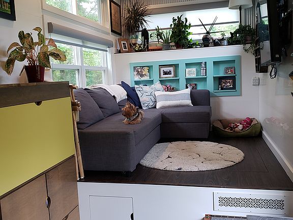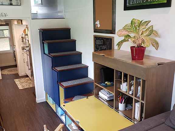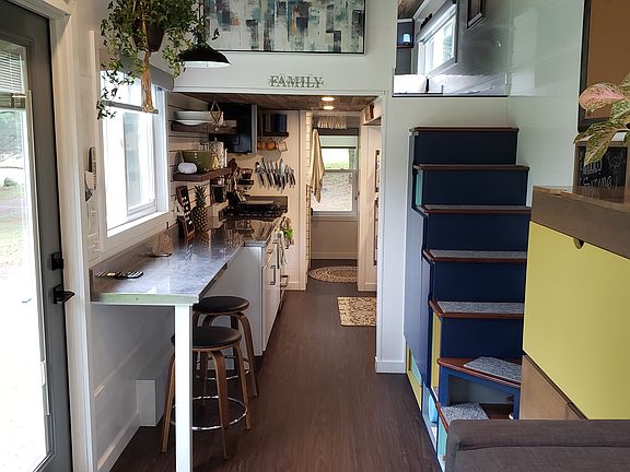 We are selling our 36' Modern Tiny home! It is built on a 32' Trailer-made-Trailer with both ends having 2' cantilever lofts, one used as a plant loft and one to extend the length of the bedroom loft. Wood and metal accents throughout the home give it a very warm modern industrial feel. Full storage stairs to enter the loft which houses a large closet and bedroom area. Lifted living room with storage underneath and custom office computer desk that folds away neatly while not in use. Galley style kitchen and dining room nook with custom stainless steel countertops and custom subway tiled backsplash in the kitchen! Custom floating shelves from reclaimed railroad ties and 8 full-size cabinets under the counters allow for all the storage you will need, plus some! Propane stove/oven, microwave, and large refrigerator give the kitchen all the utility and storage any family will need. The bathroom features a large stall shower with custom tile work to match the kitchen and thick glass doors bringing in the luxury any homeowner would desire. 2 in 1 washer dryer combo allowing you to wash and dry a load of laundry within 2 hours + clothes drying rods strategically placed in the bathroom ceiling for line drying delicates or the whole load if that is what you desire. The home will also come with a composting toilet. Other features: spray foam insulation within the walls, ceiling and between floor and trailer, custom roll-down blinds, all energy-efficient lighting and appliances, rooftop deck with custom metal ladder and railing, brand new tigerwood front deck and 2 sets of stairs, 8 solar panels with all the set up you will need minus the batteries (currently grid-tied solar). Features Include: Storage Loft, Sleeping Loft, Laundry, Deck, and Stairs
