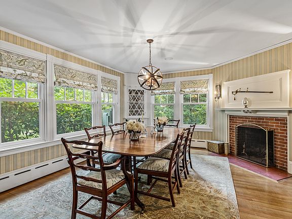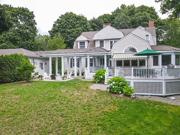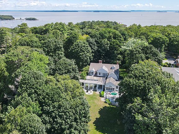 Breeze Hill - This is a fantastic opportunity to own one of Camden's great shingle style homes on a beautiful 2.2 acre lot in the Chestnut Street historic district. Extensively renovated by the current owners in 2008 with Cold Mountain Builders, this exquisite home blends the charm of a classic shingle style cottage, with the comforts of contemporary living. A great combination of thoughtful design and high-end craftsmanship. The home includes 3 floors of generous living space. The first floor features a wonderful open, spacious, and very well appointed kitchen with high-end Thermador and SubZero appliances, including a double oven, 6-burner gas cooktop, wine refrigerator, and a warming drawer. There are two Miele dishwashers and a wet bar area, and a walk-in pantry with a sink. There is a great sunporch, leading to a back deck with a retractable awning overlooking the extensive back yard, and a patio area. There is also a connected breezeway that leads to a three car garage. Living and dining rooms with wood burning fireplaces, a comfortable den with a gas fireplace and built ins, and a large game room on the first floor that could also be used as a first floor bedroom option. There is also a full bathroom on the first floor for those looking for one floor living opportunities. There is a spacious primary bedroom suite on the second floor with walk in closets, and a radiant heated bathroom with double marble vanity, a clawfoot soaking tub, and separate steam shower. Four additional bedrooms complete the second floor with laundry and two more full bathrooms. The top floor has a great office area, as well as a bunk room and play space. Heat pumps throughout provide for air conditioning in the warm summer months, automatic standby generator, top of the line heating system, basement level workshop, beautiful gardens, large and private yard and circular driveway. This is a wonderful home in a terrific location.