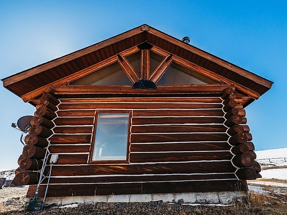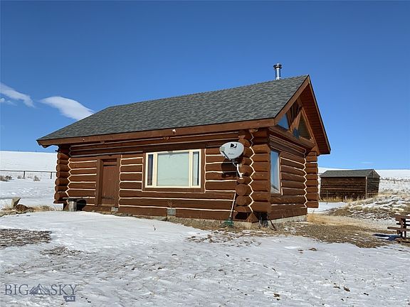 Custom log cabin on a small acreage lot, surrounded by very large acreage properties. Very private, expansive views, no known covenants. Hand hewn, thick logs from just north of Yellowstone National Park frame the main floor and gable ends, creating a 16' interior ceiling above common area with a sleeping loft/bedroom above. The cabin is accessible off of a county road, about two miles from a paved state highway. The lot has considerable privacy for its acreage and provides for commanding views east to the Crazy Mountains and south to the Absaroka Mountains and the northern entry to Paradise Valley. Unobstructed southern exposure. The location is near the Shields River; a Yellowstone River fishing access/boat launch is a short drive away. Wood flooring was recently refinished. Roof is newer. Exterior stain and chinking are more recently applied. Sleeping loft for bedroom. Room on lot to expand. ~40 minutes to skiing @ Bridger Bowl.