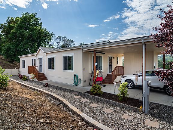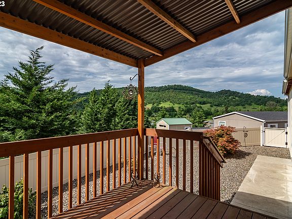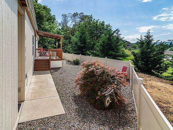 Spectacular views! Become the second owner of this beautiful 3-bedroom 2-bathroom 2018 manufactured home in River Place Park located in the Roseburg/Green district. This home has many extra's with a corner office, custom kitchen cabinets and countertops, walk in pantry, Whirlpool appliances LG washer & dryer, alarm system, low maintenance landscape with timed sprinkler system, covered deck trex fencing and much more.