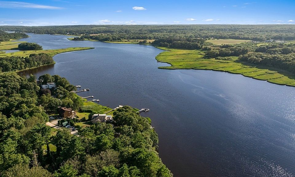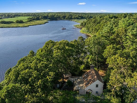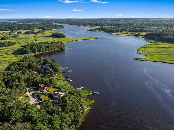 A rare offering on the East Branch of the Westport River, this refined waterfront retreat blends architectural charm with natural beauty. Once a summer cottage, it’s now a sophisticated year-round home filled with light and walls of glass. A dramatic solarium with hardwood floors and a gas fireplace welcomes you, while a private footbridge leads to one of three decks overlooking the river. The chef’s kitchen—updated 2021–2024—features a Wolf cooktop, double ovens, new dishwasher, handcrafted cabinets with stained glass, granite counters, island, and desk. The adjacent living room boasts vaulted ceilings, hardwood floors, and a wood-burning fireplace. A 13' x 31' great room anchors the home with sweeping 180° river views and a striking gas fireplace. Three bedrooms include a lower-level suite with walk-out patio access. With two full baths, a private dock, and serene setting, this is one of Westport’s most picturesque waterfront properties.