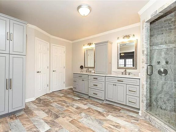 Cozy renovated brick front home on cul-de-sac lot *newly painted exterior and interior *new flooring *2 storey foyer with updated lighting *formal dining room *formal living room with double French doors *spacious family room with built-in bookcases and gas log fireplace *gourmet chef's kitchen with oversized breakfast bar island, built-in wine cooler, granite counters, white cabinetry, stainless steel appliances, including double oven, custom, walk-in pantry and large breakfast area *luxury spa like owner's retreat with adjoining sitting room / office* Sauna* Deck with firepit great for entertaining guests* Excellent school District* Walking distance from Settle's Bridge Park* Renter responsible for utilities. First month's rent due at signing. No smoking allowed, No pets allowed.