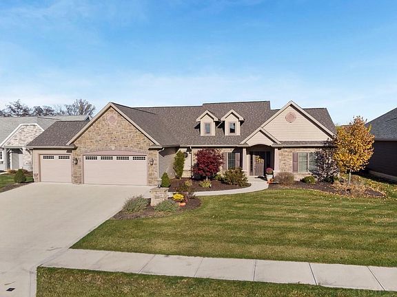 Stunning Quality Crafted Built Villa In Graystone At Timber Ridge. This 3 Bedroom, 2 ½ Bath Ranch, With A Separate Den Is Everything You Will Ever Need!! Covered Front Porch Leads To Inviting Foyer. Large Cathedral Great Room With Beamed Ceiling, Stone Gas Log Fireplace, Built In Cabinets, Shelving & Wall Of Windows With Loads Of Natural Lighting. Great Room Shares Open Concept With Chefs Island Kitchen, With Walk In Pantry, Custom Cabinetry, Deep Drawers, Pull Out Shelving, Huge Island, Quartz Counters With Tile Backsplash & All Appliances Remain. Screened Porch & A Lanai, With Cathedral Ceilings Fans, On The Pond & Backyard Facing East! Huge Master Suite With Crown Molding, Wall Of Windows, Walk In Closet, Private Bath With Double Vanities, Quartz Counters, Walk In Tile Shower, Separate Water Closet, Attached Laundry Room & Pockets Doors That Separate Them All! Slpit Bedroom Concept With A Guest Suite On The Opposite Side Of The Home With 2 Nice Size Bedrooms, Full Bath, All Of Which Can Be Closed Off With A Pocket Door For Privacy! Custom Landscaping Around All Sides, 3 Car Garage With Extra Storage Room Behind, 2x6 Construction, Security System, Sound System, Speakers, Irrigation System & More. Average Utilities: City Utilities $115/Mo, National Republic $14.75/Mo, REMC $110/Mo, NIPSCO $100/Mo. This One Is A Beauty That Will Not Last, Schedule Your Tour Today! Dues Cover: $300/yr for All of Timber Ridge residents paid Jan 1. $2400/yr for villas. Covers 28 - 30 mowing's, spring mulch, at least 4 fertilizations (some with weed killer, etc) and snow removal. Fall trimming in November. Irrigation runs 3 times a week and is also covered. Water for irrigation comes from the ponds so no charge for water.