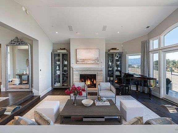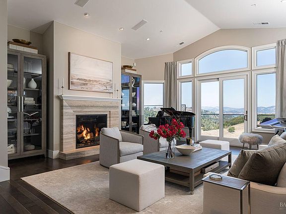 Situated adjacent to a large section of Tiburon's protected open space, this captivating, recently remodeled estate captures sweeping 180 views of Mt. Tam, the Bay, and nearby rolling hills. The grand entry leads to the formal living & dining rooms and the stunning chef's kitchen w/ Calacatta marble countertops, top-of-the-line stainless steel appliances, and an adjacent family room, all offering the expansive view. The main-level primary suite includes a private terrace and spa-like BA. The lower level is designed for entertainment, and features an expansive rec area, incl. wet bar, walk-in wine cellar, pocket-billiard & card area, movie theater w/ plush seating for 9, and direct access to view-side terraces & 2 fire pits. The property also features a detached 1BR/1BA guest house, perfect for visitors, extended stays, or use as a separate office suite. Outdoors, enjoy multiple patios, inviting hot tub overlooking the Bay, low-maintenance AstroTurf lawns, & generous entertainment areas embodying the CA indoor-outdoor lifestyle. Located within the highly rated Tiburon school district, this residence combines timeless elegance, architectural detail & the ultimate in modern amenities. 6,400 sq ft main residence w/ 5BR, 4 full & 2 half BA, plus separate 475 sq ft 1BR/1BA guest house