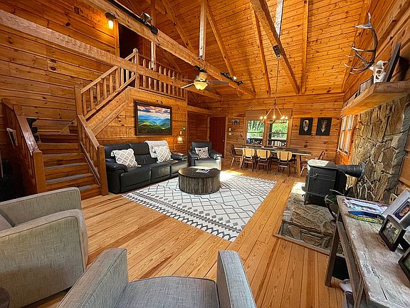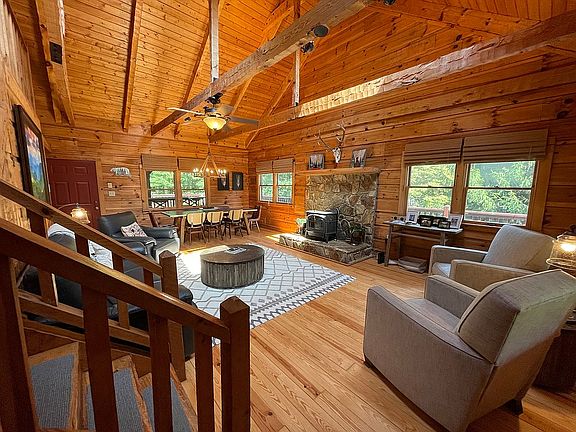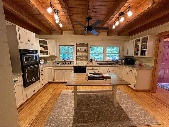 Bring the whole family to this beautiful year round home in a park like setting. The home is located directly across the street from Lake Glenville and includes private access to your private dock. Circular driveway with large two car detached garage and plenty of parking. Home is all wood construction, milled on site from trees on this lot. Hand hewn log timbers throughout. New HVAC 2019. Newly updated kitchen with granite counter tops and new appliances. Master Bedroom on the main floor with two guest bedrooms upstairs. Complete lower floor has an office, den, playroom, bathroom, storage and laundry room. Back deck overlooks very private fenced in level back yard. Comfortable and cozy living space. Two additional adjoining vacant lots are included with this home. Total of 5.67 acres of fully usable land. Come for the season, or come for a lifetime. Home is in excellent condition and ready for you and your family to enjoy.