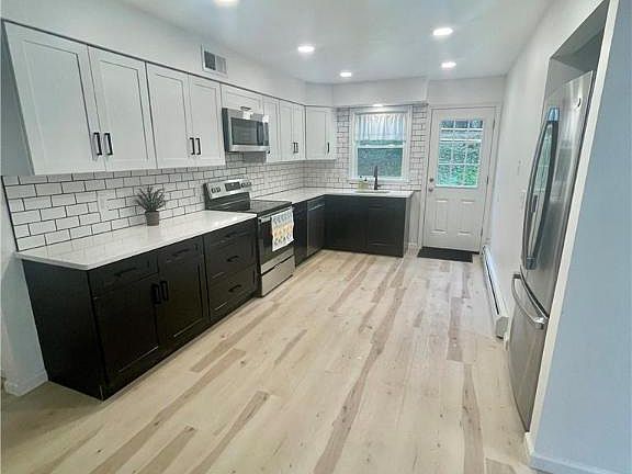 This totally remodeled Modern A Frame in Tuscarora Village features 4 bedrooms, 2 bathrooms. The large great room includes a floor to ceiling fireplace. Bright and open rec room on the lower level. New windows, siding, doors and railings to name a few. Large kitchen with brand new stainless steel appliances, beautiful espresso lower cabinets, and white uppers with white quartz counter tops. Ample closet space throughout home. The second floor features a balcony off the main living room, and a large deck for entertaining off of the dining room.