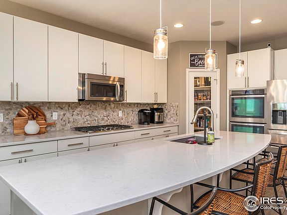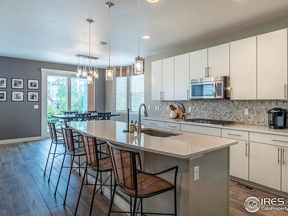 Former model home w/ upgrades conveniently located walking distance to community park and rec center as well as Old Town Erie shops, restaurants & cafes. Chef's kitchen w/ island, quartz counters, tile backsplash, gas range, double ovens, slide out drawers and pantry. Spacious great room is centered around a gas fireplace w/ designer tile surround and wood mantle. Luxury primary suite w/ 5 piece bath, soaking tub, huge walk-in closet and stylish barn door. Upstairs includes 5 bedrooms, a loft/homework area and a laundry room. Features a new roof and solar panels that are owned plus two furnaces & two AC units for added comfort. A covered front porch, tandem 3 car garage and lushly landscaped yard make this home a must see!