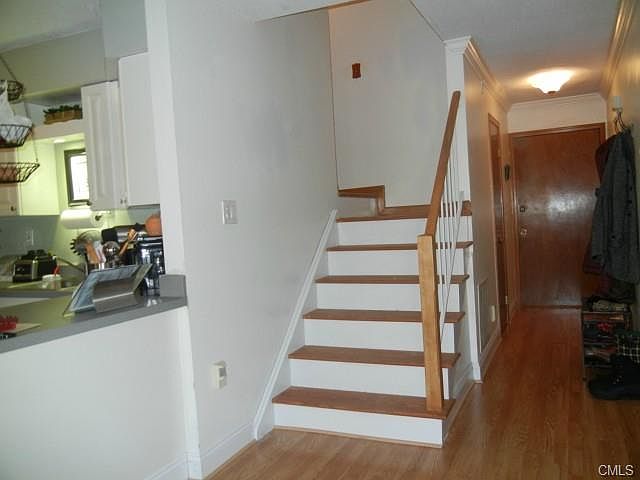 Great starter or downsizer 1BR twnhse w/garage under. Pretty laminate flr thru LR,DA & kitchen. New lighting & stainless appliances too. A few stairs to MBR, bath & laundry. Full bsmt w/big window offering opportunity to expand sq ftge & even add bath. End unit, nice deck.