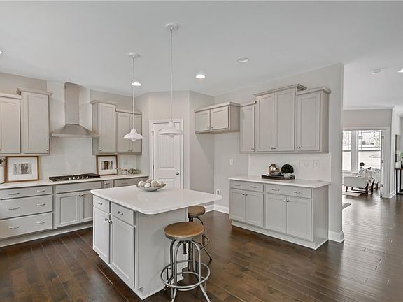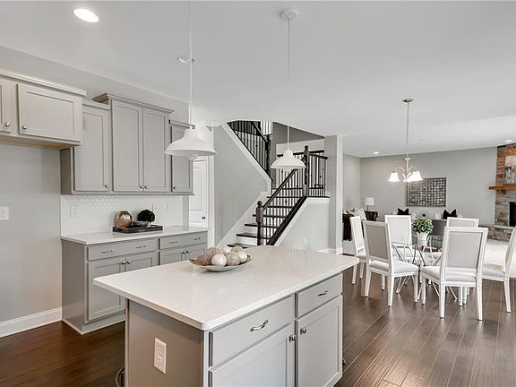 - Kitchen Features: Cabinets Stain, Eat-in Kitchen, Pantry, View to Family Room, Kitchen Island, Solid Surface Counters