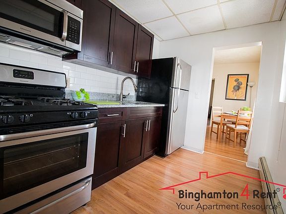 - Exterior features: , 1 block from the SUNY bus line, Bicycle storage, Easy online rent payments, Garbage included in rent, Heating system: Baseboard, Modern kitchen, On-site laundromat, Walking distance to downtown Binghamton
