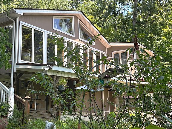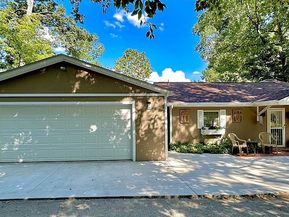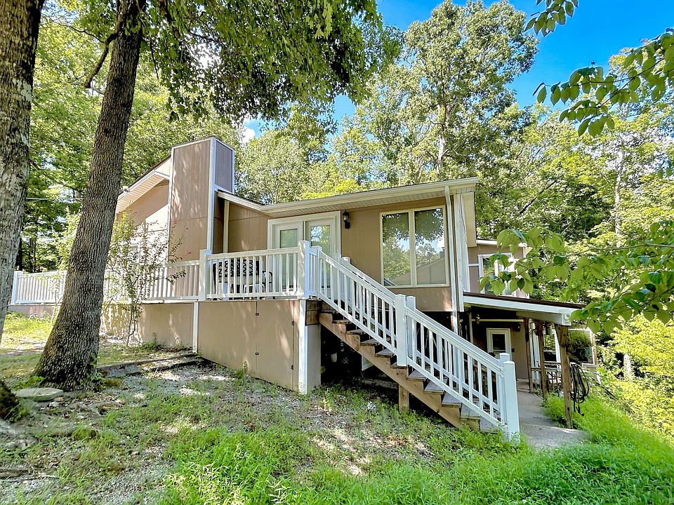 On the main level, a sitting room is immediately off the great room and includes a beautiful decorative fireplace with a gorgeous, wooden, floor-to-ceiling mantel. A utility room with washer/dryer hookups (washer/dryer not included with the property) are accessible through convenient french doors.. A small hallway provides access to two bedrooms. A shared half bath connects the two bedrooms, and the master bedroom has a luxurious full bathroom with two sinks and ample counter space while a skylight offers warm illumination.Adjacent to the kitchen in the great room is an office space with stairs down to a second unit. The downstairs unit is a studio-style bedroom with built-in shelves, a full bath, and its own washer-dryer hookup (with appliances staying with the home). The door at the top of the stairs has the security of an exterior door, and the studio has its own access outside. It's an ideal candidate to be a fantastic AirBnB! Outside, the property provides a new two car garage (built 2023; 24.25'x21.5') with plenty of room for storage. A modest deck leads to a paved area that could easily be used as a patio and includes additional storage available in an enclosed, built-in shed under the great room. Just beyond the paved area is semi-cleared hillside ready for a gardener with a green thumb. The property south of the hillside is owned by the Army Corps of Engineers, so there is no worry of a new development obstructing the pristine view of Lake Cumberland. The roof of the house is brand new - installed summer 2025. The surrounding area is abundant with possibility! Pleasant Hill Boat dock is only 0.6 miles away. The stunning beauty of Little Lily Creek Falls are less than 5 miles away (on your way to Jamestown from the home). Charming Jamestown, KY is 6 miles away and bustling Russell Springs, KY is 10 miles away - close enough for convenience but distant enough that your piece of paradise feels all your own.