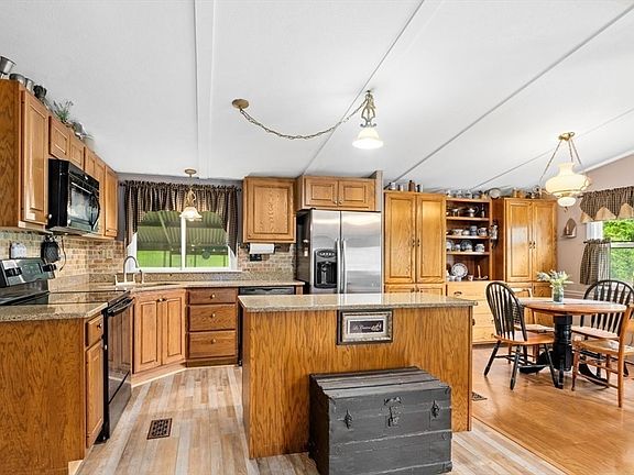 Absolutely delightful double-wide home in probably the nicest and most private setting in the park. Large open living-dining area with beautiful custom built-ins. Fully applianced kitchen with loads of cabinets and granite countertops. Master bedroom is huge with a large full bath and walk-in closet. Second bedroom is spacious, with a good-sized closet as well. This lovely home has loads of closets, cabinets, and an unbelievable amount of storage. Separate utility room with washer and dryer. Attached is a large carport with more storage. This is a rare opportunity to own a fabulous home with a private, gorgeously landscaped yard in a very desirable park. Park share of $25,000 is to be purchased by new owner. Cats allowed, and 1 dog under 30 lbs. is also permitted. The park fee includes water, sewer, taxes, trash removal, snow removal, and basic cable! DON'T MISS OUT!