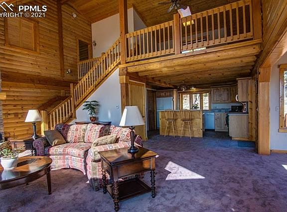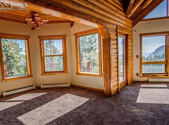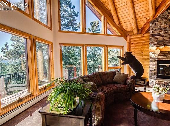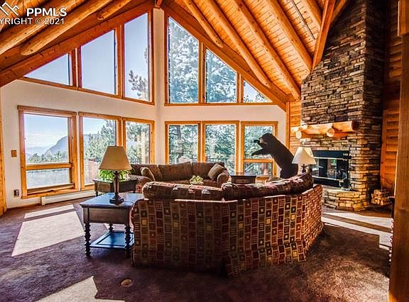 Custom log home with great location, spectacular red rock, forest and multi-range mountain views, and privacy on 6.8 acres! Open concept with tongue & groove vaulted ceiling and log beams. Large living room with floor to ceiling windows to capture the great views. Wood fireplace to take the chill out in the cool evenings. 2 large bedrooms in main level with 3/4 bath. All new carpet throughout the home. Kitchen has hickory cabinets, all appliances included, and Elmira gas range with 2 electric and temperature-controlled warming ovens. Walkout lower level has a 23x24 family room, plus a 15x28 game room with a unique, custom turquoise-inlaid, beetle-kill pine wet bar, built-in BOSE speaker system, and built-in cabinets. A 3/4 bath, boiler room, a laundry room including washer, dryer and folding table, and beautiful French doors complete the lower level. Oversized garage access has 2 single overhead doors with the square footage of a 3-car garage with lots of storage, a sink, a work-out area with wiring and wall mount for TV. It includes a formerly separate, buildable, adjacent lot and has gate logs on the property. New roof is to be installed. The wonderful clubhouse, playground, exercise room, pool and tennis courts available through the community property owners' association are sure to please! (see flyer in listing) Just 10 minutes to Cripple Creek, and close to Divide and Woodland Park. It's a pleasure to show!