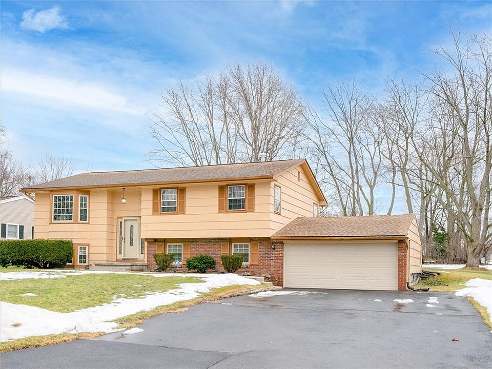 Fabulous updated / upgrade raised ranch in move-in condition! You're going to love the open floor plan of the living room, dinning area and kitchen for every day living and when you entertain your guests. The sliding door off of the dining area opens up to take you out and onto the deck overlooking the back yard with a green belt directly behind and available for you when you want to take your 4 legged friends for a stroll around the neighborhood. Lower level has been partially finished for a family / rec room. A fourth bedroom is also in the finished lower Level. There is a walkout to the backyard. The old real estate cliche of location, location, location applies here. Close to shopping, RIT & MCC, health services and dining opportunities, NYS Thruway. Tear off roof is 10 years young, HVAV is 6 years and hot water heater 7 yrs, 220 service in garage for charging EV cars. We'll be open Saturday 3/8 and Sunday 3/9 both days from 1-3pm. Delayed negotiations until Tuesday 3/11 at noon, make offers good until following day, Wednesday 3/12 at noon.