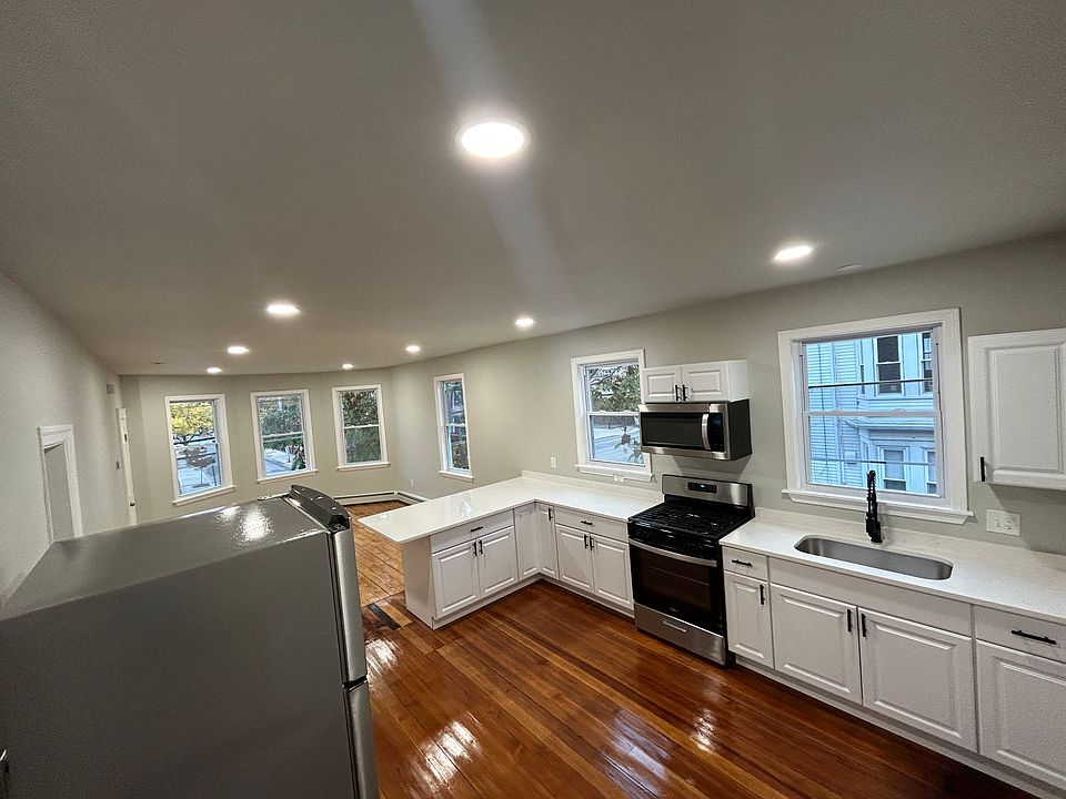 This unit has been freshly renovated from top to bottom and is ready for your immediate occupancy. A excellent 2 Bedroom 1 Bathroom located in the heart of the highly desirable Reservoir Triangle neighborhood in Providence, RI. This units open concept kitchen includes a stainless steel gas stove/oven, stainless steel built in microwave/ vent, and stainless steel refrigerator. Over sized closets in bedrooms with shared storage in basement. Brand new gas system provides you with on demand heat and hot water. 1 driveway space included with plenty of street parking available. Located 3 minutes from RT. 10 on ramps, 5 minutes from 95 on ramps, and 10 minutes from Downtown provides prime access for your commute, excellent local dining, exciting city entertainment, and major shopping centers. 1st months rent plus security deposit due at signing, minimum 1 year lease. Dogs ok, $50-$100 per month pet fee depending on size/breed. Tenant pays gas and electric. Water and sewer included.