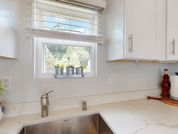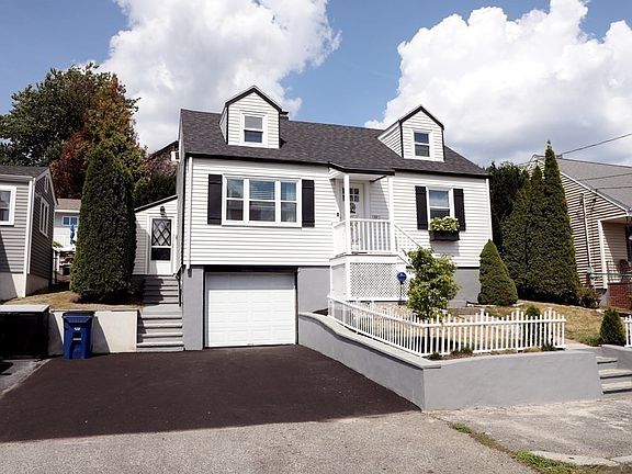 MODERN Contemporary Cape 4 Bdrms w dining rm option in great West Revere neighborhood with Boston skyline views. Recently remodeled open concept front to back livingrm / kitchen area. Beautiful professionally landscaped FENCED In Backyard with stone patio area.. ...shed.. walkup trail around the rear of property overlooking views of the city! Oak hardwood floors throughout! Main level features, custom kitchen w Calacatta Flutter quartz counters w stainless steel GE gas appliances. Side mudroom features many windows/ light with 2 separate entrances. 1 car garage & full basement for storage. Recent upgrades include: new roof/ new front porch/ new windows/ new driveway/ new shaker kit/ new gutters/new flr & freshly painted throughout. Two parking spaces plus garage space. Convenient location close to Boston, Logan Airport, public transportation and 2.5miles from REVERE BEACH!