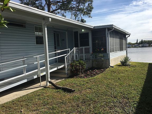 This large, sunny home offers a beautiful lake view with 50 feet of frontage on a community lake. It's the perfect vacation getaway or second home, complete with screened sun porch and fishing dock. One owner since built in 1991. Master bathroom has a walk-in shower, second bathroom has tub with shower. Kitchen opens to breakfast area and living room. Dining room has built-in china cabinet. Wheelchair accessible ramp to front door entry (can be removed). New roof February 2018. Neighborhood amenities include clubhouse with pool, community room, and planned social activities year-round. Brand new Sea wall and large deck 12' x 24' Laminate floors, new double pane windows, new kitchen appliances and remodeled. New paint now Tan.