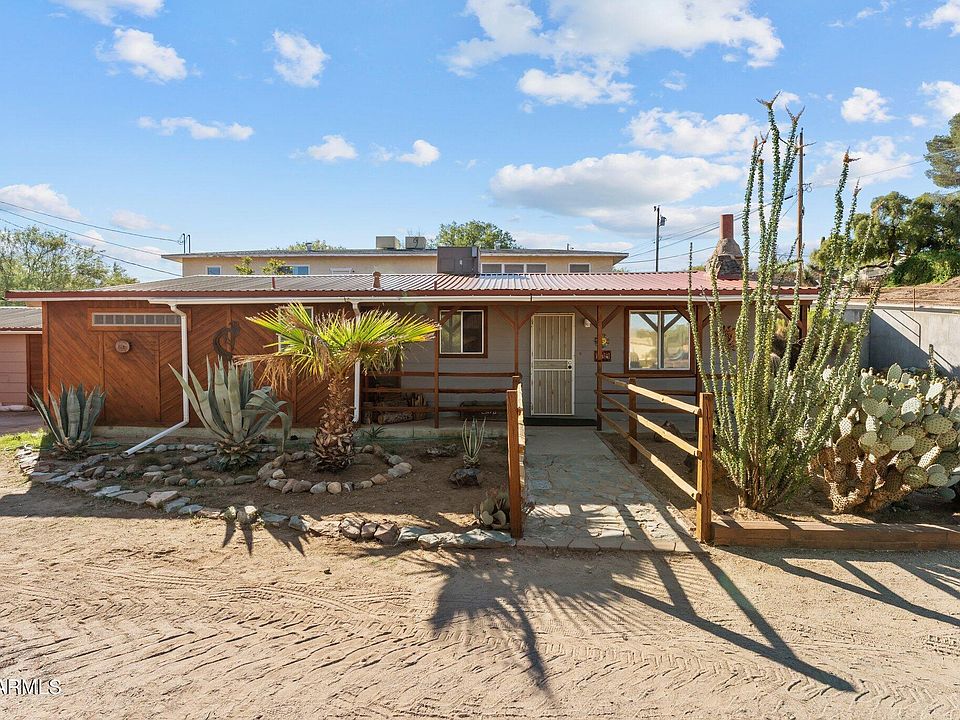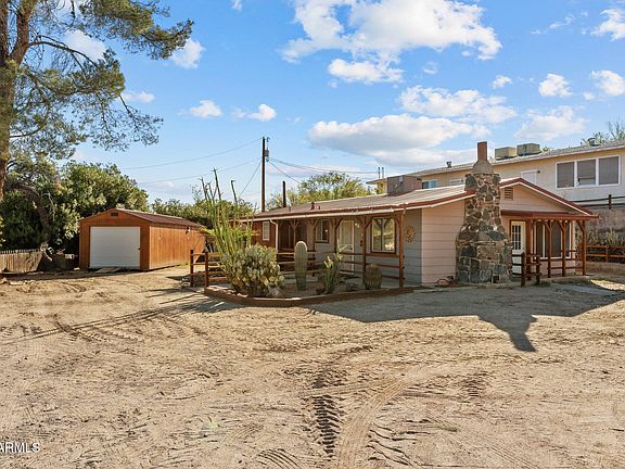 Charming Home in Wickenburg. This welcoming 5-bedroom, 2-bathroom home, built in 1965, offers generous living space with the character and craftsmanship of its era. Located just minutes from downtown Wickenburg, you'll enjoy the perfect balance of quiet residential living with convenient access to local amenities. The home features a large open kitchen perfect for family gatherings, plus a convenient secondary kitchenette offering flexible living options. Step outside to the covered patio for a peaceful backdrop for your morning coffee or evening relaxation. Cozy up during cooler months around the classic stone wood-burning fireplace that adds warmth and rustic charm to the main living area. This property comes fully furnished—ready for immediate enjoyment as a winter residence or investment opportunity. Additional features include a spacious 12' x 32' shed/garage providing ample storage for vehicles and equipment. Being offered "as-is," this home presents an excellent opportunity for buyers looking for a property with good bones and plenty of potential. Embrace the authentic Wickenburg lifestyle in this practical, well-located home that combines comfortable living spaces with Arizona's natural beauty.