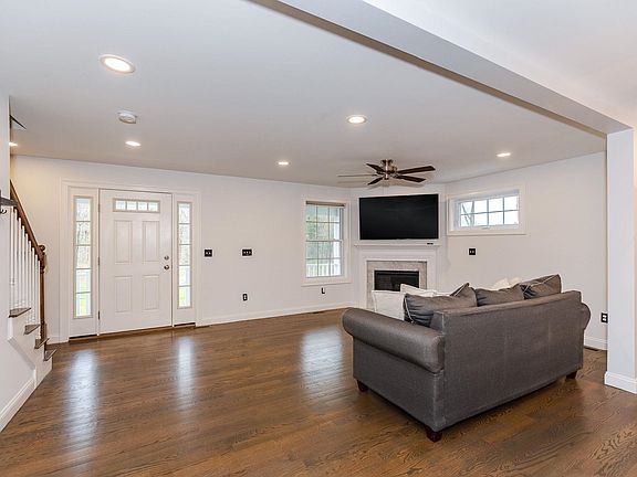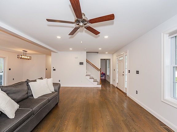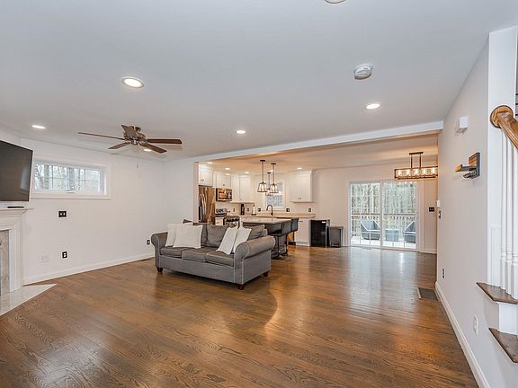 Welcome to this cape style home situated on a 1.58 acre lot with a beautiful front farmers porch. Spacious open concept first floor perfect for gatherings, features include a sunny eat-in kitchen with island, dining room, cozy family room with a gas fireplace, half bath and family room or home office. On the second floor you will find the Primary bedroom with a private bath and walk-in closet, two more bedrooms and a full bath will complete this level. Other features include a two car garage, first floor laundry, central air and hardwood floors. Enjoy the tranquil wooded backyard in this private retreat. A must see home!