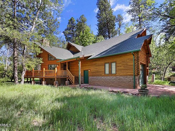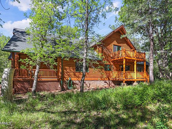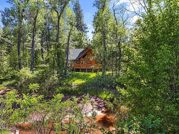 This log cabin in the pines gives the best of two worlds. All the comforts of home and the sights, sounds, smells and cool air of the mountains. Hunter Creek runs full length (164 ft) of the .97 acres of property. The trees, ponderosa, oak and apple to name a few, enhance the ambiance. The cabin was built with full 8'' logs. It has vaulted wood tongue and groove ceilings with a floor to ceiling stone fireplace, the flooring is bamboo downstairs and pine upstairs w/ carpet in the 4 bedrooms. Off the large upstairs loft there is a bedroom and an oversized game room with open deck, complete with pool table, air hockey & ping pong. The large kitchen has beautiful juniper slab countertops, brand new stainless steel appliances, and a one of a kind Juniper Slab table for 8. The primary bathroom has juniper slab counters and copper sinks with lots of room! Pre-plumbed for a stand alone tub. The full second bathroom has a custom rock wall. Utility room has washer dryer, extra storage and a toilet with a shower. Plumbed for an extra sink. There is a playground/treehouse in the yard, a wrap around deck at the front overlooking the creek. Covered deck at kitchen looking out at lush vegetation. Private covered deck at primary bedroom. Lots to do and located in a gated community with paved roads, underground utilities, HOA water and sewer. All furnishings, linens and kitchen supplies are included in the price, just bring your toothbrush, and a change of clothes.