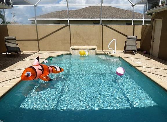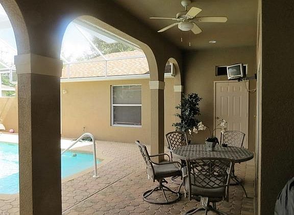 Beautiful Courtyard home located in Central Cape Coral. This home is a family dream come true. The main home features an open living area with a formal dining room and a spacious eat in kitchen with wood cabinets, solid surface counter tops and all NEW kitchen appliances. Master bath has a soak tub plus a walk in shower and dual sinks. Inside laundry room plus hurricane shutters and alarm system. Ensuite 3rd bedroom is a separate and private guest quarter. Courtyard features pavers and a heated large in ground pool. Close to all shopping areas plus all assessments are in and paid. Make your appointment today.
