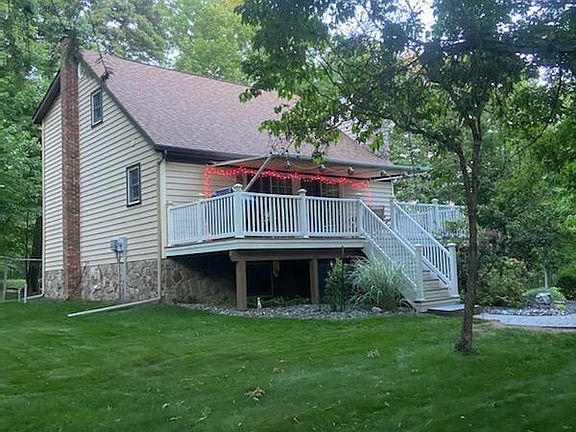2 story contemporary home located on a beautifully landscaped lot features paved driveway, trex deck with retractable awning and storage shed. Step inside to the large living room with brick faced wood burning fireplace, kitchen with granite countertops, dining room, master bedroom and 2 additional bedrooms, 2 bathrooms, family room with wood stove, laundry room with storage area and heated 1 car garage. Quiet and serene with seasonal lake views.