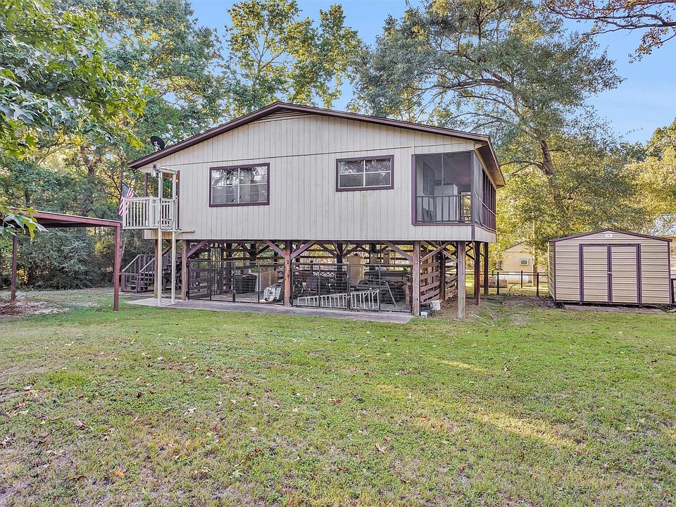 Check out this one of a kind home in the Lakewood community, located on Lake Livingston. This 3 bedroom, 2 bathroom home sits on stilts and has never been flooded. The first level offers so much potential and is equipped with power and closed in with fencing. There is a cargo lift/elevator or stairs that can take you to the main home level. You are welcomed with a large covered patio in the front and another covered and screened in patio in the back that is tranquil and perfect for relaxing. Inside, the open concept floor plan makes for easy living. The primary bedroom offers an en-suite bathroom. All rooms are spacious with newly installed carpet. Updates include Generac Generator, PEX waterline, new ductwork, on demand tankless water heater, metal fencing. The storage building sits on a 12x16 slab and provides extra storage. Washer, dryer, refrigerator stay. Community offers gated entry, boat ramp, and picnic area. Come see what Lakewood has to offer! Low taxes!