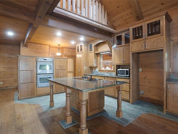 Huge stone fireplaceInterior elevatorLarge beamsHuge panoramic view windowsRushing mountain streamLarge covered outdoor kitchenStainless grill