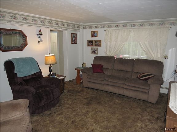 Affordable village home with spacious living room, dining room, half bath, eat-in kitchen and first floor bedroom, Upstairs features two bedrooms and the full bath. Vinyl siding and replacement windows make for low maintenance exterior. The private back deck is ideal for the grill and afternoon relaxing. Heat system and water heater are just ten years old.