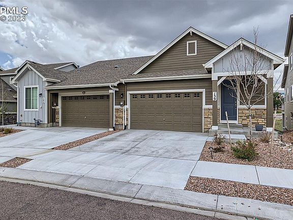 Stunning nearly new paired ranch in Rockrimmon. Main level boasts a wide open floor plan, owners entry with laundry room, kitchen with island and pantry, dining area, great room with fireplace and walk out patio access. Kitchen is beautiful with classic white cabinetry, granite island/bar top, gas cooktop, granite countertops. Living space has a gas fireplace built in shelving and a luxury ceiling fan, custom remote control blinds in living room and dining room, spectacular light fixtures throughout. Primary bedroom with attached en-suite. En-suite is complete with 4-piece bathroom and walk in closet, granite countertops, double sink, glass shower with white subway tile surround and built in seat. Secondary bedroom with adjacent full bathroom. Unfinished basement with walk out patio, 2 car attached garage and auto-sprinkler system. Close to I-25, near hiking trail, fire station, park, schools and shopping centers.