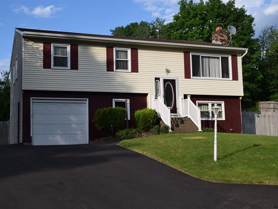 Nothing to do but move into this spacious raised ranch that sits on a 1.29 acre lot in a desirable neighborhood. Remodeled eat in kitchen (2015) with granite, SS appliances and Thomasville self closing cabinets. Recent updates include NEW Roof (2017), NEW H2O tank (2018), NEW Central Air (2019), NEW driveway (Oct 2019) and remodeled full bath (2015). Main floor living features gleaming hardwood floors. The generous size master bedroom features a wall closet. Basement living space includes a family room with a propane fireplace, full bathroom and open office that could be easily turned back into 3rd bedroom. Walk out basement that leads to the fenced back yard. Schodack School District and near I-90 for easy commuting to Albany or Pittsfield.