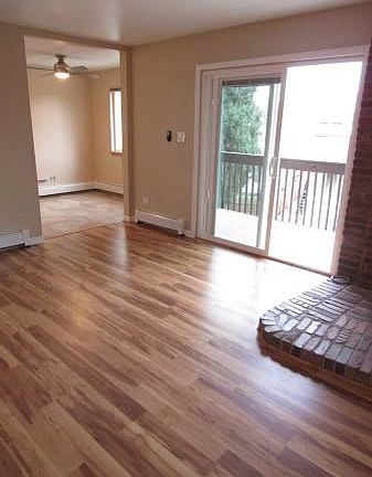 Two bedroom, 1 bath condominium. Very nice layout Top floor, corner unit. Very private. No one lives below. Large balcony overlooking courtyard and pool. Private entrance with second balcony. Assigned parking close to unit. $1150 rent includes heat and hot water. Has AC. Two blocks from Garrison light rail station. Shops nearby. Call 720-394-4595.