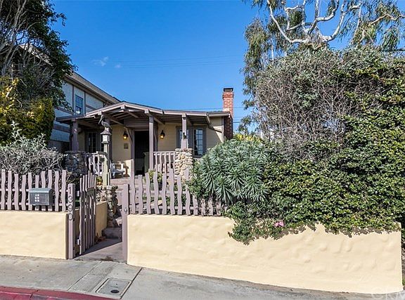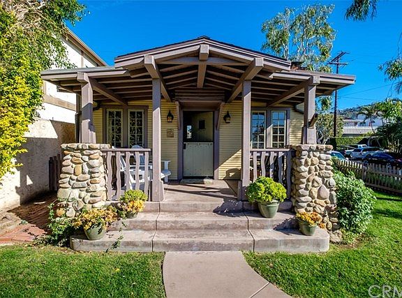 LOCATION, LOCATION, LOCATION. This quintessential 1923 K-rated Craftsman bungalow and former home of "Jan Brady" from America's TV show "The Brady Bunch" & renowned artist John Carl Doemling, is abundant in historical charm with a pride of ownership that is apparent throughout. Recently remodeled & expanded in 2003 by local Architect Gregg Abel. Enter through the custom hand carved picket fence into the well-appointed front yard on a wraparound corner lot. Adirondack chairs await on the front porch under a gable roof by a Dutch door with ocean views. Inside, the historical integrity is detailed throughout from the original oak floors to the real wood and gas burning fireplace, wainscot walls, & original glass pane windows. Masterfully updated kitchen with farmhouse sink, stone countertops, custom cabinetry, metal ceiling tiles, gas range, built in pantry closet, & extra counter spaces. Step into the master bedroom ensuite with open beamed vaulted ceilings, 8' steam shower, dual vanity sinks, & spacious countertops. A den/office or nursery sits off the master bedroom with a wet sink and separate entrance. Exit down the hall to the second bedroom with full bathroom and soaking tub. Spacious outdoor patio makes perfect for private entertaining. Two car tandem driveway with carport makes parking a breeze, being just two blocks to everything. Also featured in "Vintage Cottages", a special edition of appointed cottages of Laguna Beach & can be registered for the Mills Act Registry.