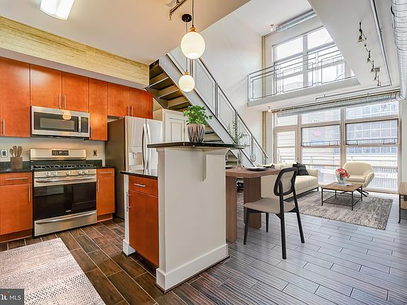 Stunning 2-level loft condo at Kenyon Square is City living at its best. Two bedrooms & two new baths surround living spaces with soaring ceilings and huge windows. This light-filled unit is an entertainer's paradise. The unit conveys with a secure garage parking space & extra storage unit. Kenyon Square is a full-service building with 24 hour desk service. The building is adjacent to Metro, shopping, dining, weekend farmer's market & much more!